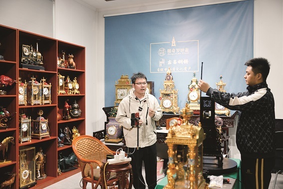 11月17日,在東昌府區道口鋪街道非遺直播間內,工作人員在介紹東昌銅鑄鐘表。 近年來,該區積極創新非遺文化傳播方式,利用短視頻、直播等新媒體手段,增強非遺項目的可視化展示效果;鼓勵非遺與現代設計理念結合,開發符合現代需求的文化創意產品,拓展非遺的市場空間,推動“非遺+”多元融合發展之路越走越寬。